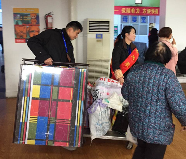 2月28日上午9點多,東站售票廳里一位70多歲的大媽正吃力地拖著一袋滿滿的東西往危檢儀挪動。正在服務臺上班的劉虹看見了,趕緊推著“流動之家”服務小推車上前幫忙。當劉虹幫著大媽一起把那一大袋物品放上小推車后,大媽吞吞吐吐地說道“姑娘,在外面門口我還有幾袋東西,我的班車時間又快到了,你看能不能幫忙把我那幾袋一起推進去啊?”看著大媽求助的眼神,深知旅客出門不易的劉虹沒有猶豫,問了聲“東西在哪里”后就隨著大媽來到東站南大門口。