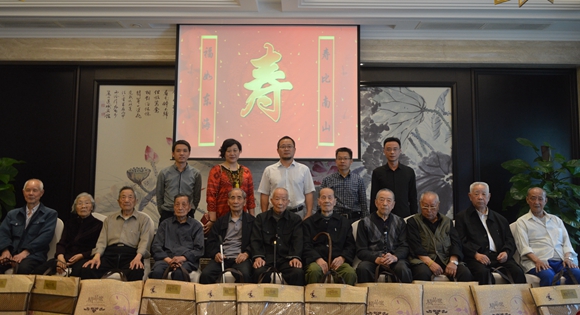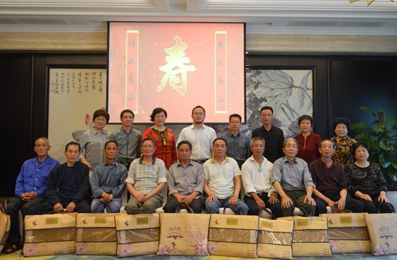 左邊是“福如東?!睂憹M衷心祝福,右邊為“壽比南山”送上美好祝愿,遒勁的“壽”正居中央。 5月4日,麗汽集團(tuán)黨政工領(lǐng)導(dǎo)齊聚一堂,在蓮城賓館為70歲、80歲和90歲及以上老同志集體祝壽。