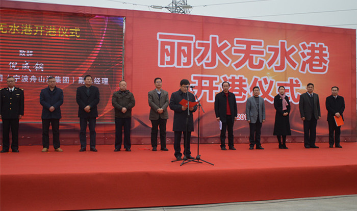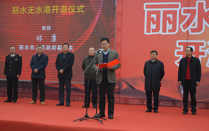 在熱烈的掌聲中,林康副市長(zhǎng)宣布麗水無(wú)水港開港。
