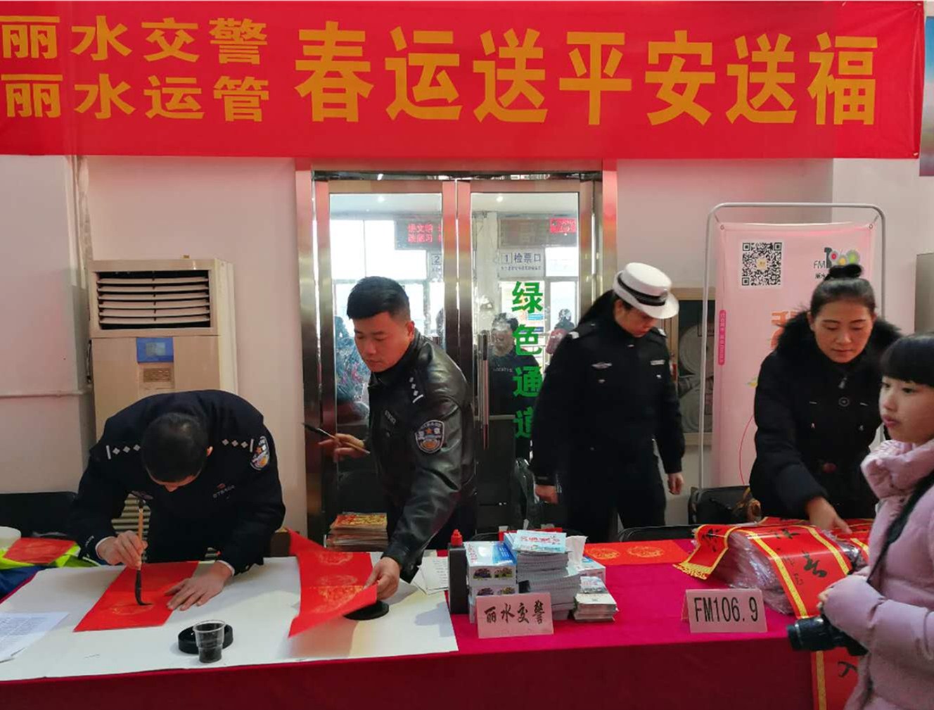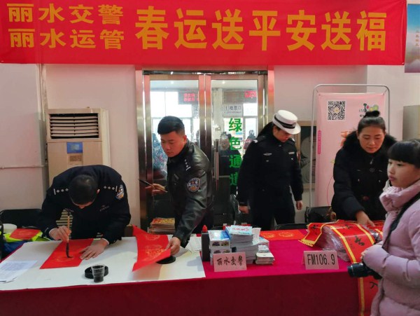 麗水交警、麗水運(yùn)管攜手麗水郵政的同志們給廣大旅客送來了新年的祝福,他們給旅客準(zhǔn)備了承載著祝福的福袋,提筆為旅客寫下一幅幅承載著吉祥、平安的春聯(lián),為2018年的春運(yùn)啟動增添了喜慶的氣氛。