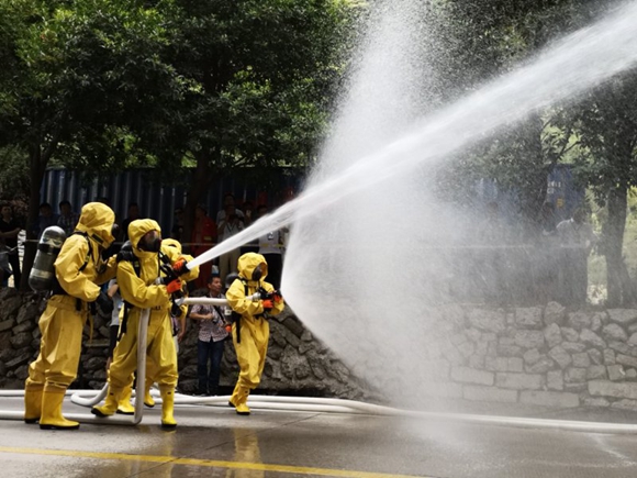 演練模擬一輛大客車在危險品運輸罐車事故路段受阻,面對危險品泄漏爆炸危險,道路運輸工作人員立即組織乘客撤離危險區(qū)域,及時上報險情并采取安全處置措施,等待交警、消防員、醫(yī)護和環(huán)保測評等人員趕赴現(xiàn)場處理的過程。短短10多分鐘,20個場景的演練科目流程一氣呵成。演練場景驚險逼真,扣人心弦,贏得了在場觀演人員和群眾的一致好評。