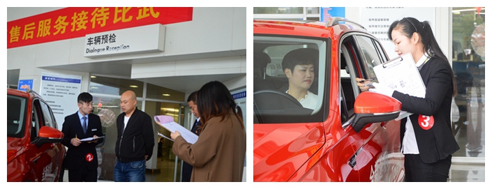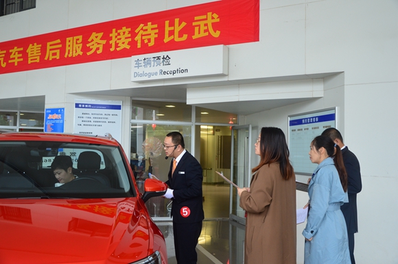 在下午進行的售后接待比武項目中,主要設(shè)置了禮迎客戶、環(huán)車檢查、唱檢車檢項目、車輛問診、簽訂委托書等環(huán)節(jié),考察選手對維修接待崗位工作技能的熟悉程度和解決實際問題的能力。選取服務(wù)接待的典型工作任務(wù)--常規(guī)保養(yǎng)接待,要求選手按照真實工作情境接待顧客并做好服務(wù)。