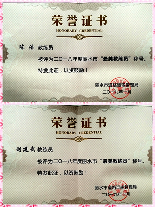 近日,麗水市道路運輸管理局印發(fā)了《關于表彰2018年度“文明示范駕培學校”及“最美教練”的通報》,麗汽汽校在評選活動中脫穎而出,順利通過評審組復評,再次榮獲年度市級“文明示范駕培學?!睒s譽稱號,這也是我校連續(xù)六年榮獲此項殊榮。同時,麗汽汽校的陳浩、劉建武兩位同志獲得2018年度麗水市“最美教練員”稱號。