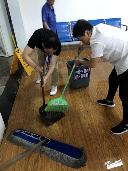 4月24日下午2點(diǎn)后,由于受強(qiáng)對(duì)流云團(tuán)影響,市區(qū)出現(xiàn)了7-9級(jí)大風(fēng),并伴有強(qiáng)雷電和大暴雨。由于這場(chǎng)雨下得又大又急,東站新舊候車(chē)廳交界處的下水管出現(xiàn)了倒灌現(xiàn)象,短短幾分鐘時(shí)間,新候車(chē)廳5、6號(hào)檢票口附近的地面就積滿了水。值班站長(zhǎng)金翔見(jiàn)狀趕緊叫來(lái)工作人員和清潔工,不顧地面的積水和正在往下漏的雨水,合力進(jìn)行積水清理。他們拿起掃把、畚斗、垃圾桶、拖把等工具共同加入戰(zhàn)斗,一邊清理一邊不忘提醒過(guò)往的旅客注意腳下,防止滑倒。