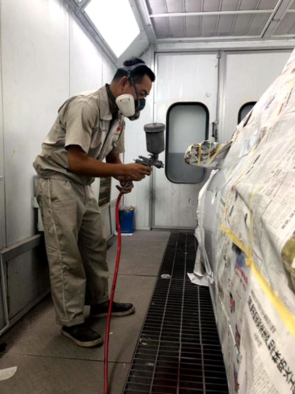 烤漆房的溫度極高,已經接近45度,噴漆施工時必須關門窗戴上防毒面具,油漆師傅額頭上的布滿了密集的汗珠,上衣也已經濕了大半。油漆的氣味,高溫的炙烤,這種感覺旁人是無法體會的。