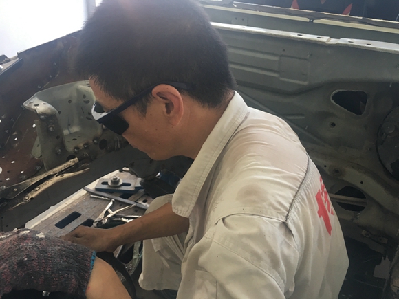 【鈑金工】這是鈑金師傅們,主要從事汽車局部的切割、焊接、整形,儼然是車輛的美容師。其實他們都是一個個皮膚粗糙,滿手老繭的“匠人”。走進鈑金車間,師傅們正在進行車輛局部的切割,隨之而來的便是吱吱呀呀…的噪音。師傅們絲毫沒有受其影響,為了防止切割時飛濺的火星燙傷,大家的頭上、腳上都穿戴上厚重的防護用品,把自己裹得嚴嚴實實,還沒開始干活,就已是滿身汗水了。為了如期能交車,師傅們雖然熱的揮汗如雨,但沒有停下手中的工作,而是專業(yè)專注的完成每一個步驟。