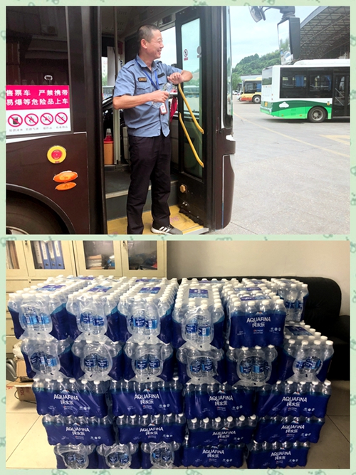 慰問現(xiàn)場, 處州晚報(bào)送水隊(duì)伍將一箱箱的礦泉水送到了客運(yùn)西站一車隊(duì)辦公點(diǎn),隨后由城鄉(xiāng)公交運(yùn)務(wù)科責(zé)人親自帶隊(duì),前往各個重要的公交站點(diǎn),為一線的公交駕駛員送“清涼”。表達(dá)對高溫天氣下城鄉(xiāng)公交駕駛員始終如一堅(jiān)守崗位,辛苦工作的崇高敬意,并對他們在維護(hù)麗水市民便捷、安全、環(huán)保出行所付出的辛勤勞動表示感謝。同時,處州晚報(bào)工作人員也向各位駕駛員了解城鄉(xiāng)公交在夏季防暑降溫工作上所作的成效。207路駕駛員趙成峰一邊喝著礦泉水一邊自豪地說到:“我們公司在這個月月初就做了‘送清涼’活動,我們公司領(lǐng)導(dǎo)親自帶隊(duì)送來了冰鎮(zhèn)的紅茶、綠茶?!逼渌€路駕駛員也反映:“我們公司對夏季防疲勞駕駛工作也做得很到位的,保證我們午睡休息地?!?br/> 這次的送清涼活動,體現(xiàn)了處州晚報(bào)對城鄉(xiāng)公交一線駕駛員的關(guān)心與愛護(hù),每個喝到“愛心水”的駕駛員都表示將以更積極的態(tài)度為麗水市民的出行貢獻(xiàn)自己的力量,盡心盡責(zé)把麗水的公交事業(yè)做得更好。