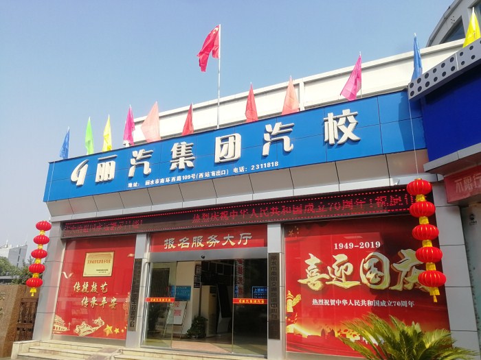 鮮艷的五星紅旗懸掛在汽校報(bào)名注冊(cè)中心大門頂端,四周插著五顏六色的旗幟,在藍(lán)天的映襯下顯得格外耀眼。大門兩側(cè),兩排喜慶的紅燈籠隨風(fēng)搖曳,烘托著祥和的節(jié)日氛圍。LED屏上,“熱烈慶祝中華人民共和國(guó)成立70周年”、“祝愿?jìng)ゴ蟮淖鎳?guó)永遠(yuǎn)繁榮昌盛”的標(biāo)語(yǔ)滾動(dòng)播放,氣氛濃厚?!跋灿瓏?guó)慶”的巨大金色標(biāo)語(yǔ)和汽?!皞魇诩妓?、傳承平安”核心價(jià)值的巨幅廣告相互輝映,相得益彰。