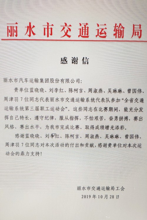 2019年10月24日,麗汽集團藍曉曉、劉李紅、曾國偉等員工參加浙江省交通系統(tǒng)第三屆職工運動會,本屆運動會麗水市交通局代表隊共派出28名運動員,其中麗汽運動員7名。
