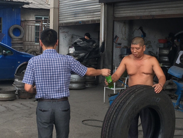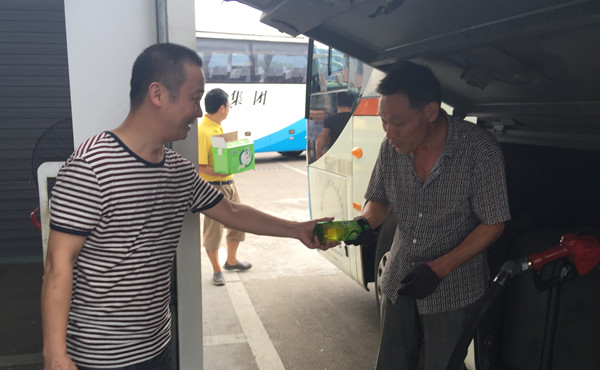 梁巍經(jīng)理為正在加油的加油工送上清涼。