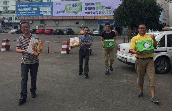 經(jīng)理梁巍、副經(jīng)理王斌、計(jì)財(cái)科科長厲志南和運(yùn)務(wù)科的蔡亞飛各捧著一箱冷飲去送清涼。