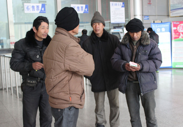 早上8:30,老吳和他的工友們?cè)缭绲氖帐昂眯欣睿轿髡举I好下午1:25去泰順的車票,這會(huì)兒拿到票,哥兒幾個(gè)才安心的準(zhǔn)備去吃早飯。他們按捺不住心中的喜悅說:“在外辛苦了一年能在春運(yùn)第一天順利買到車票回家過年,很開心!”