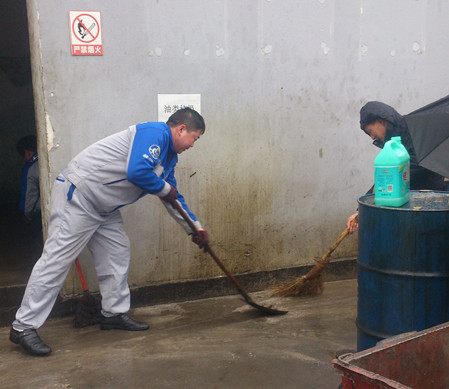 員工正在清理費(fèi)油儲(chǔ)藏室地面的油污