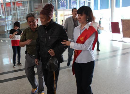 4月30日下午15:30時分,一位八十多歲的老人在五十多歲的兒子攙扶下,拄著拐杖顫顫悠悠的來到客運西站,準備乘車回慶元老家休養(yǎng)。服務班工作人員李愛秧眼捷手快,立刻迎上前幫扶。