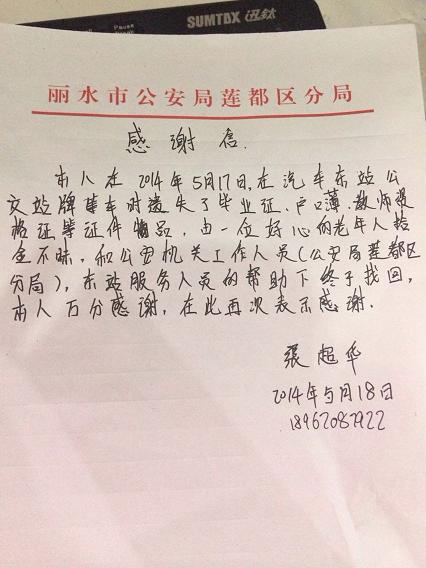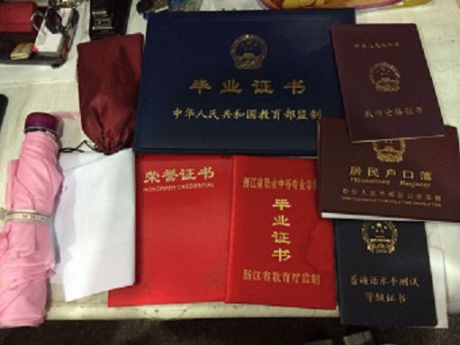 東站服務(wù)臺(tái)的楊大姐翻看了袋中物品,是一本本各式各樣的證書,總共有六本,主人名叫張超華。楊大姐心想:“這么多的證書丟了一定非常著急,有些逗還補(bǔ)不回來呢”。于是,她通過戶口簿上的信息,在東站派出所的幫助下找到失主。而失主也早已報(bào)了警,在派出所留下了手機(jī)號(hào)碼。
