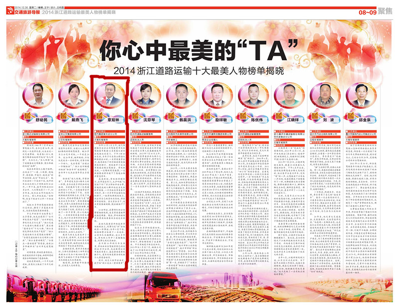 “2014年度浙江道路運(yùn)輸十大最美人物”,涵蓋了全省11個(gè)地市的一線執(zhí)法、窗口、行政人員,貨運(yùn)經(jīng)理人,客運(yùn)、出租車、公交司機(jī)等工種,拼出了浙江道路運(yùn)輸行業(yè)“最美方向盤”圖譜。章雙林有幸成為麗水唯一入選的最美人物。