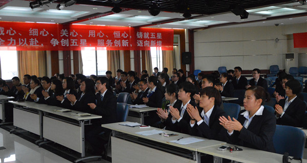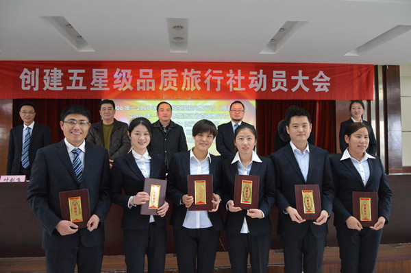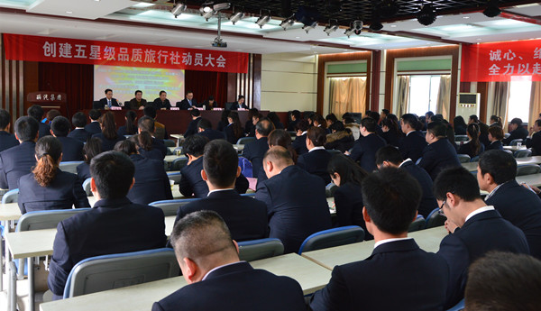 為提升麗水旅游品質(zhì),迎接高鐵旅游時(shí)代的到來,更好全面開展五星品質(zhì)旅行社創(chuàng)建工作,2015年3月10日下午15:00,麗水市旅游集散中心召開創(chuàng)建五星級(jí)品質(zhì)旅行社動(dòng)員大會(huì)(以下簡(jiǎn)稱“創(chuàng)五星”)。市旅游局副局長(zhǎng)周大勇、省旅游局旅行社品質(zhì)評(píng)定星評(píng)員張帆、集團(tuán)公司董事長(zhǎng)葉茂、工會(huì)主席呂麗君、集團(tuán)公司總經(jīng)理助理、旅游集散中心經(jīng)理葉劍飛等出席大會(huì),旅游集散中心全體員工及相關(guān)單位員工代表共一百余人參加了此次動(dòng)員大會(huì)。旅游集散中心副經(jīng)理葉學(xué)敏主持大會(huì)。