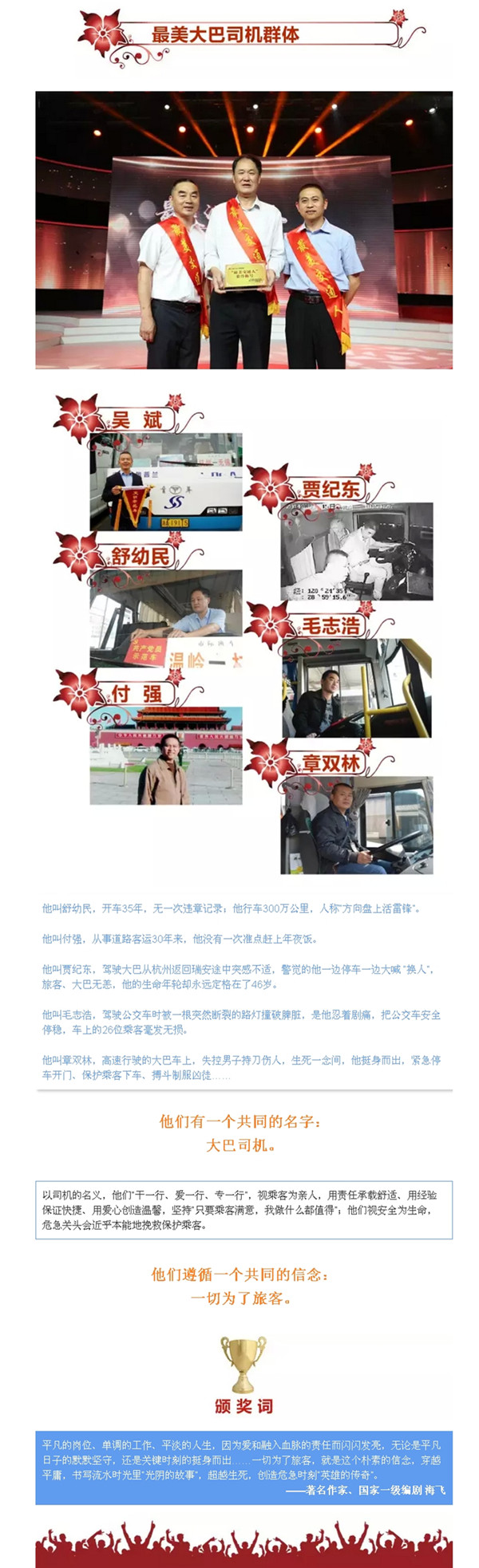 5月28日,省交通運(yùn)輸廳在浙江廣電集團(tuán)“最美浙江人?最美交通人”發(fā)布廳,發(fā)布了8位“最美交通人”個(gè)人和4家“最美交通人”集體的先進(jìn)事跡,麗汽集團(tuán)客長(zhǎng)運(yùn)分公司駕駛員章雙林與其他5位大巴司機(jī)一起組成的“最美大巴司機(jī)群體”名列其中。