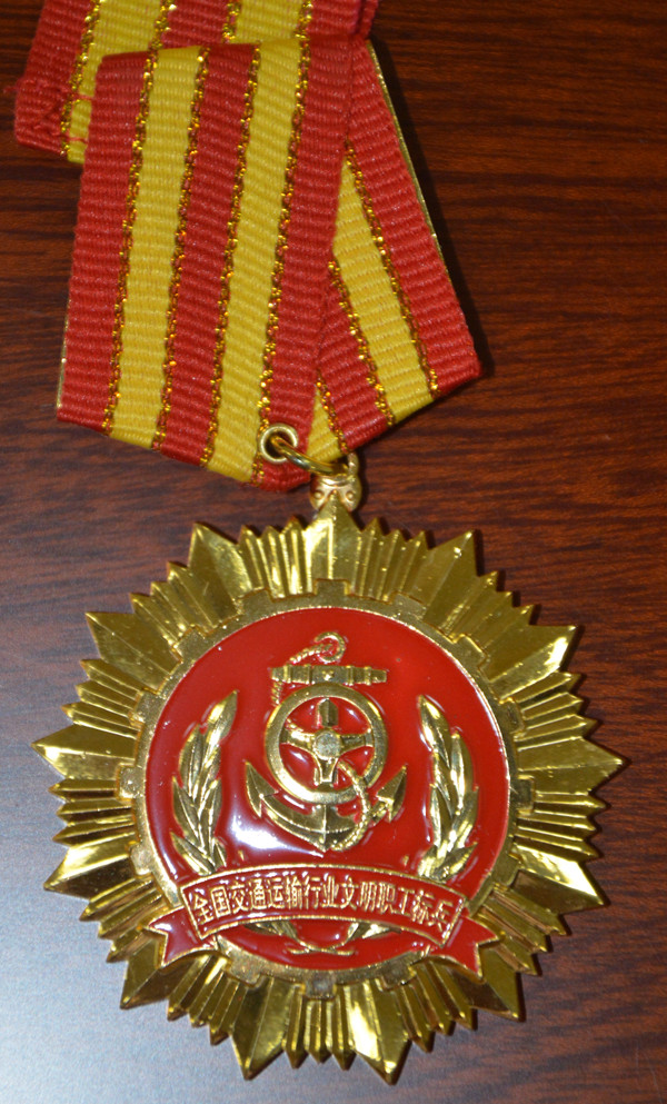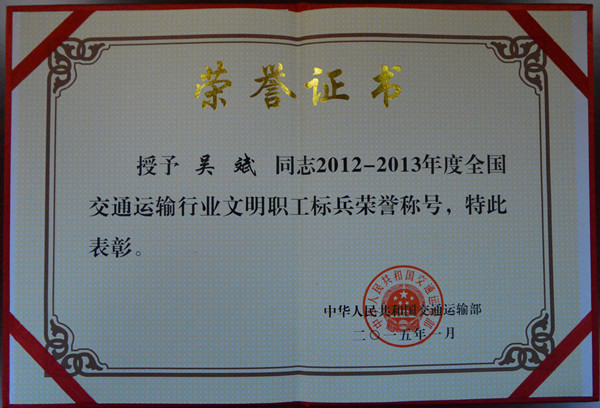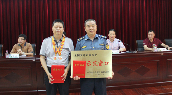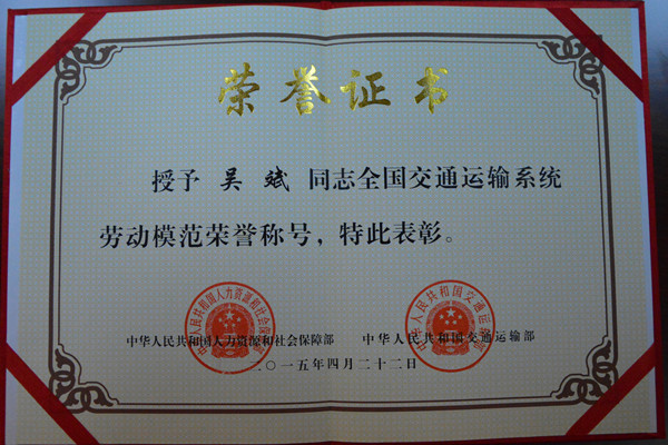 吳斌(左)榮獲全國交通運輸系統(tǒng)勞動模范、全國交通運輸行業(yè)文明職工標兵稱號
