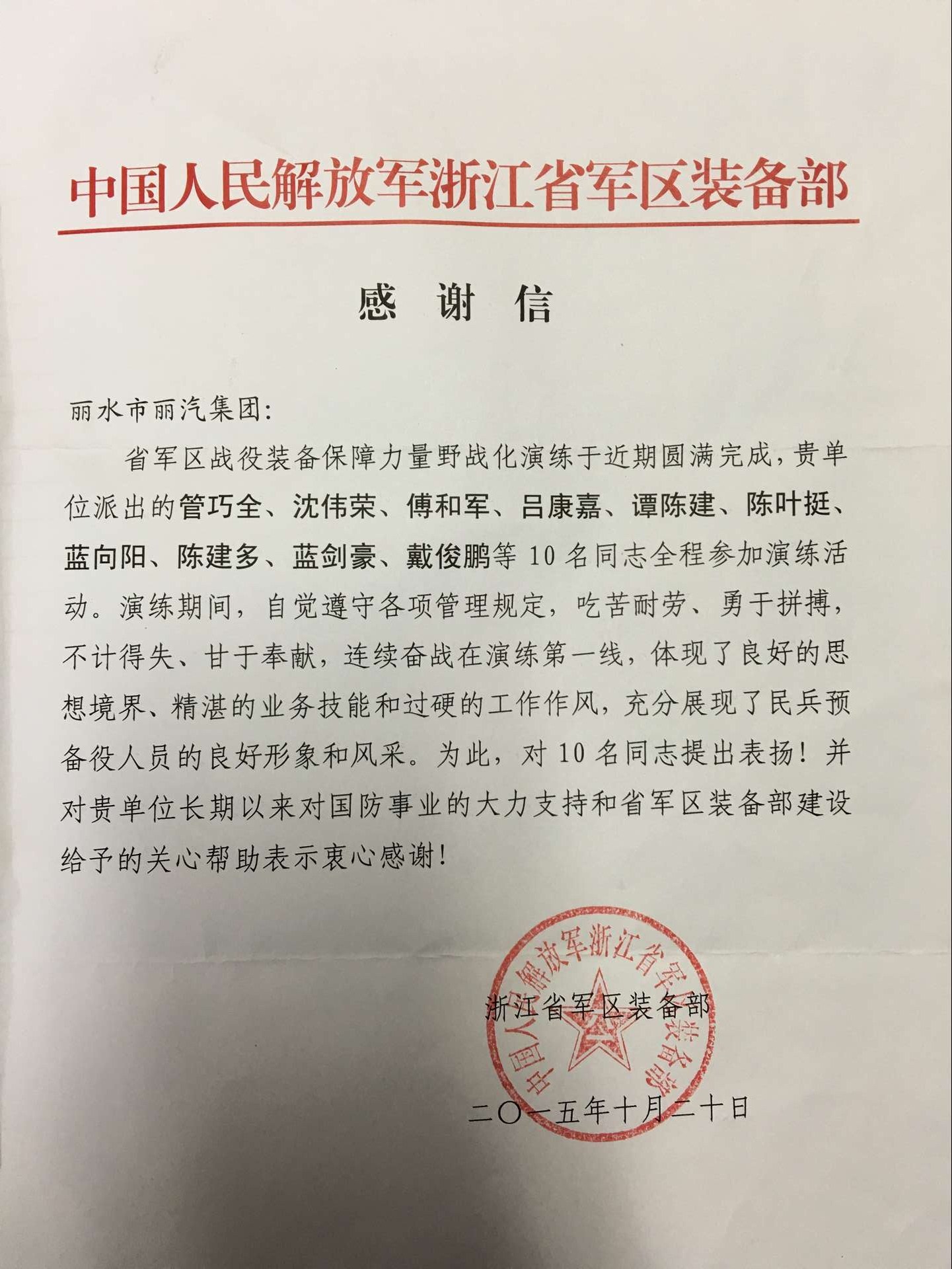 11月19日,麗汽集團收到浙江省軍區(qū)裝備部的一封感謝信。信中對來自快客、伊翔、長運、甌龍等公司的修理工予以了表揚,充分肯定了麗汽員工在參加省軍區(qū)裝備部組織的戰(zhàn)役裝備保障力量野戰(zhàn)化演練中的優(yōu)異表現(xiàn)。