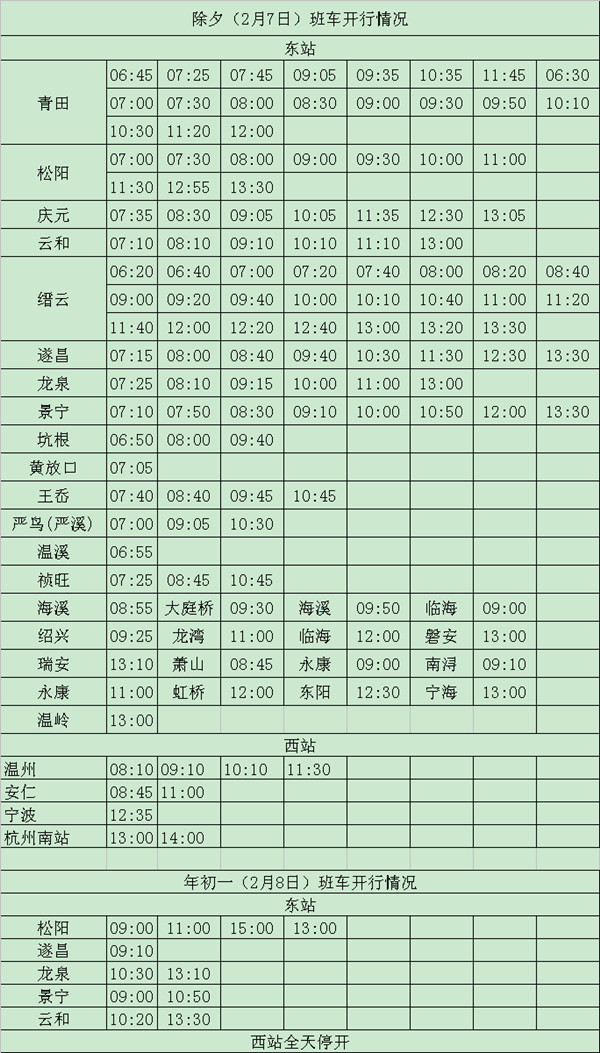 其中,除夕當天, 西站有開往杭州、寧波、溫州等方向的市際班次和開往安仁的班車,最遲發(fā)車時間至14:00。東站有開往龍泉、 云和、 松陽、慶元、景寧、遂昌、縉云、青田及部分縣市下屬鄉(xiāng)鎮(zhèn)的縣際班車,以及前往臨海、紹興、龍灣、瑞安、蕭山、永康、虹橋、東陽、寧海、溫嶺等地的市際班車,最晚的發(fā)車時間為當天中午13點30分。正月初一,西站全線停運;東站有發(fā)往龍泉、松陽、景寧、遂昌、云和方向的縣際班次 11班。根據班次安排,年初二客車班次逐漸恢復,年初四起全部恢復正常發(fā)班。