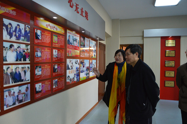 在麗汽集團(tuán)榮譽室,工會主席呂麗君向李良福副廳長介紹涌現(xiàn)出的各類先進(jìn)典型