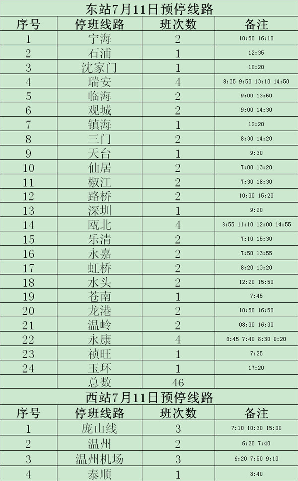 因臺(tái)風(fēng)“燦鴻”影響,為確保乘客安全,麗汽集團(tuán)客運(yùn)東、西兩站暫時(shí)停開下列班車,具體復(fù)班時(shí)間視11日臺(tái)風(fēng)情況再行公告。