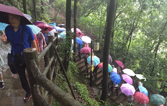 南明山的山道上,大家穿著雨衣、撐上雨傘、并肩前行,成了一道最美的風(fēng)景!