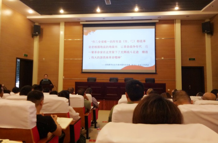 市委黨史研究室、市地方志辦公室主任雷華英從浙西南革命精神的歷史概況、內(nèi)涵和解讀、弘揚踐行浙西南革命精神三個方面授課。在革命戰(zhàn)爭年代,老一輩革命家在麗水所有的縣市區(qū)都留下了光輝戰(zhàn)斗足跡,締造了偉大的“浙西南革命精神”。周恩來同志在麗水的抗戰(zhàn)史;粟裕、劉英同志帶領(lǐng)中國工農(nóng)紅軍挺進師,與麗水人民一道浴血奮戰(zhàn),團結(jié)一心干革命,播撒了開啟光明的寶貴革命火種。直至如今,偉大精神已深深融入麗水大地,流淌在處州兒女的血脈中,成為激勵一代又一代麗水人堅定理想信念、戰(zhàn)勝一切困難、奪取前進道路上一個又一個勝利的力量源泉。