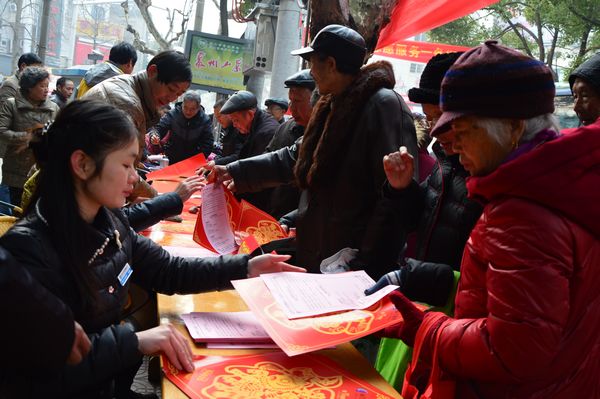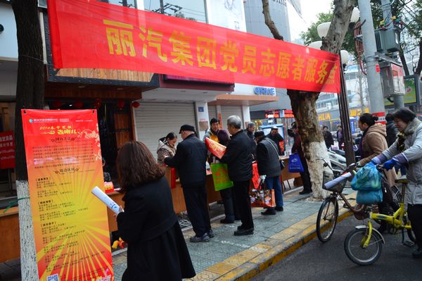 “貼上真正寫的春聯(lián),才有過年的味道”,一位排隊等候的姑娘對蘭老的字情有獨鐘。家住白云小區(qū)的齊大媽更是感慨自己已65歲,上還有90歲高齡母親,非要請?zhí)m老寫下:“今日正逢萱草壽,前身合是杏花仙”,橫披“九十大壽”對聯(lián),作為母親九十大壽的賀禮。拿到對聯(lián)后的齊大媽稱心滿意地說:“今天我非常高興、開心,你們這么冷的天為我們義務寫對聯(lián),抽出休息時間為人民服務,祝福你們麗汽集團生意越做越大?!?br/> 黨員們在中山街上頂著寒風,冒著嚴寒,不斷為市民們送福字,寫對聯(lián),送對聯(lián),把暖暖的祝福送給市民。據(jù)統(tǒng)計,集團公司黨員服務一條街,送出“?!弊?500余張,送出對聯(lián)200余副,發(fā)放班車時刻表、旅游信息表等1000余張。