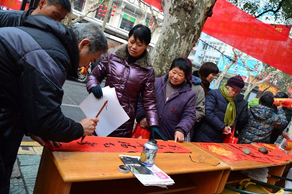 退休老黨員蘭延生、陳根松冒著嚴寒一大早來到了服務現(xiàn)場,在現(xiàn)場為市民們義務寫對聯(lián)、送對聯(lián),蘭老的字清秀大方,陳老的字遒勁有力,在一旁觀看的市民“嘖嘖”稱道,他們自覺排起了長隊,耐心等待著兩老的“墨寶”,成為“黨員服務一條街上”的一大亮點。