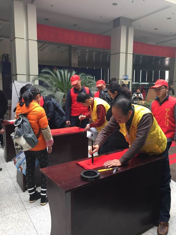 總工會的志愿服務隊伍還帶來了“志愿者書寫春聯(lián)”,現(xiàn)場寫就的200多幅春聯(lián)很快就被乘客們領取一空。