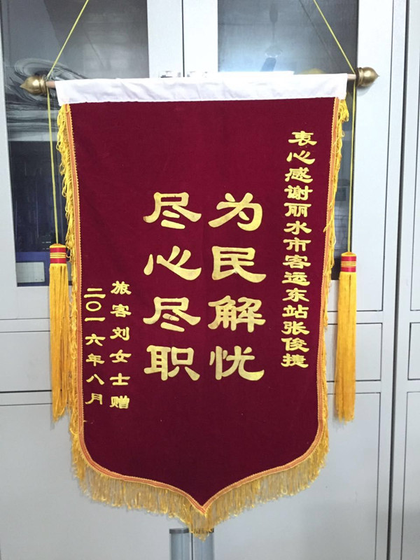8月20日上午,一位女士將一面錦旗送到客運(yùn)東站站長(zhǎng)值班室,握著值班站長(zhǎng)的手一個(gè)勁地道謝。錦旗上赫然寫(xiě)著:“盡心盡職,為民解憂(yōu)”八個(gè)醒目的大字,感謝麗水客運(yùn)東站張俊捷。