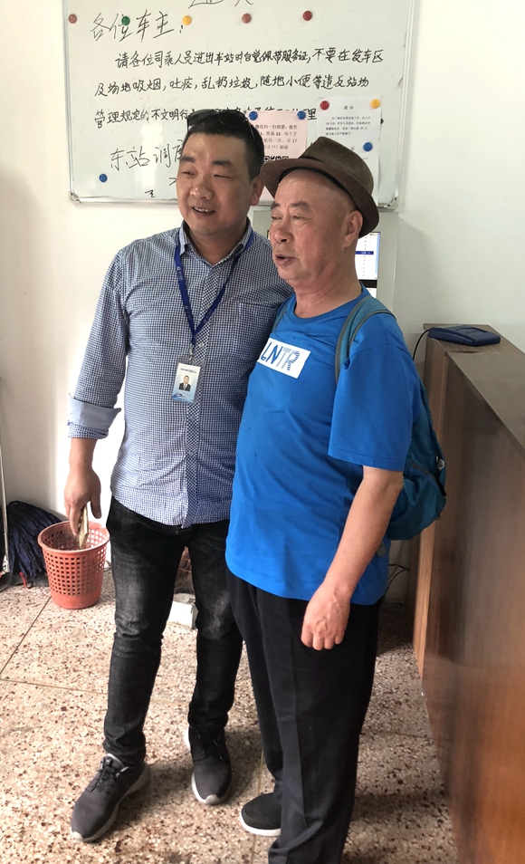 十分鐘后,失主趕到東站調(diào)度室時,正好碰到了準備發(fā)車的錢偉君師傅,失主王先生一臉感激,連聲向錢師傅道謝并且從錢包里抽出了現(xiàn)金表示要感謝錢師傅,被錢師傅婉言謝絕了。最后王先生堅持要和錢師傅合影留念,并熱心地邀請錢師傅抽空一定去北京玩。因為王先生要趕下午4時的高鐵,錢偉君師傅的班車也馬上要出發(fā),他們彼此互留了微信后,就握手道別了。