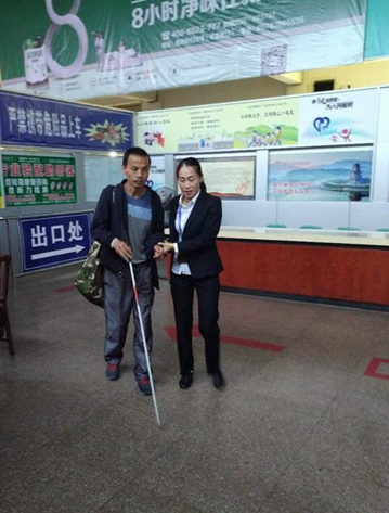 雖然眼睛看不見,但是應(yīng)安怡和江旭紅為自己忙前忙后的情形,盲人旅客心里特別的明白,他不停地向江旭紅說著謝謝,還不時(shí)地向邊上的旅客說:“麗水東站的工作人員服務(wù)真是太好了!”