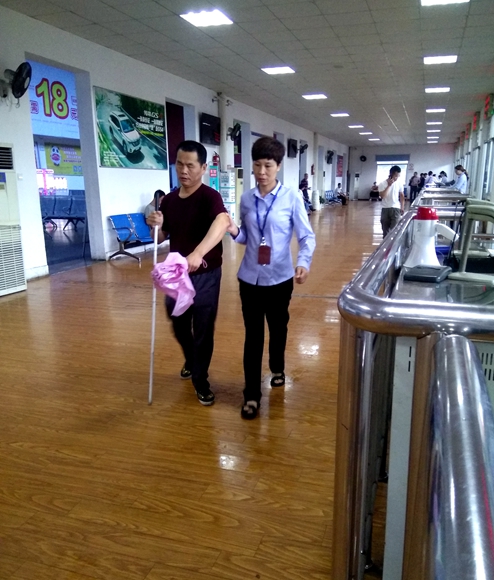 9:35到青田的車即將開始檢票,章莉走到盲人旅客跟前,準(zhǔn)備扶他提前檢票上車,這時(shí)盲人旅客不好意思的說:“我想去下廁所?!闭吕蛘f:“好的,我扶你去。”章莉一直扶著盲人旅客到男廁門口,因不方便進(jìn)到男廁里面,章莉就叫住了一位男旅客,叫他幫忙把盲人旅客扶進(jìn)去上廁所,自己則在男廁門口等待。好心的男旅客很爽快地答應(yīng)了,嘴里還一直夸章莉的服務(wù)好、東站的服務(wù)好。