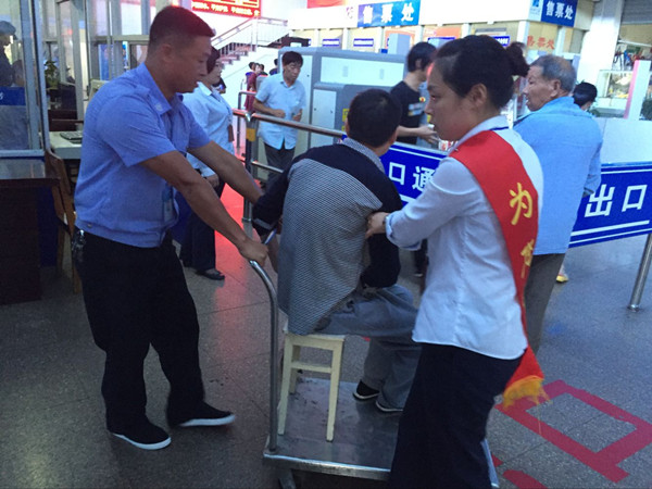 6月14日下午,在客運東站的候車室里,一輛特殊的“輪椅”引起了大家的注意,只見東站副經(jīng)理戴宏星和保衛(wèi)科的熊宣標推著由拉貨的行李車和小方凳組成的“輪椅”,余靜雙手扶著坐在“輪椅”上的旅客,他們?nèi)齻€人小心翼翼的護送旅客到檢票口。